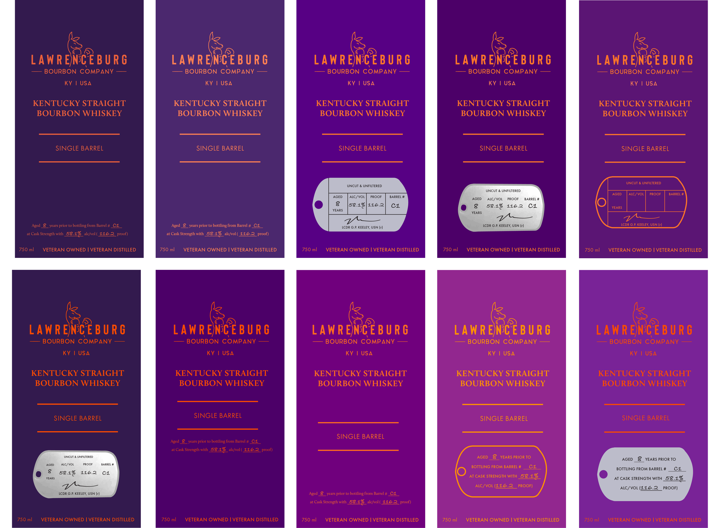 Working with Kentucky bourbon company, Lawrenceburg Bourbon Company, I assisted in a company rebrand through label design. The company recently switched to a new bottle shape, resulting in the need for a new label design. I used both Adobe Illustrator and Adobe Photoshop to create these designs, embracing their desired color scheme of purple and orange. The mockups shown on the bottle below was the final design we settled on. I also included photos of a few other variations throughout the process.