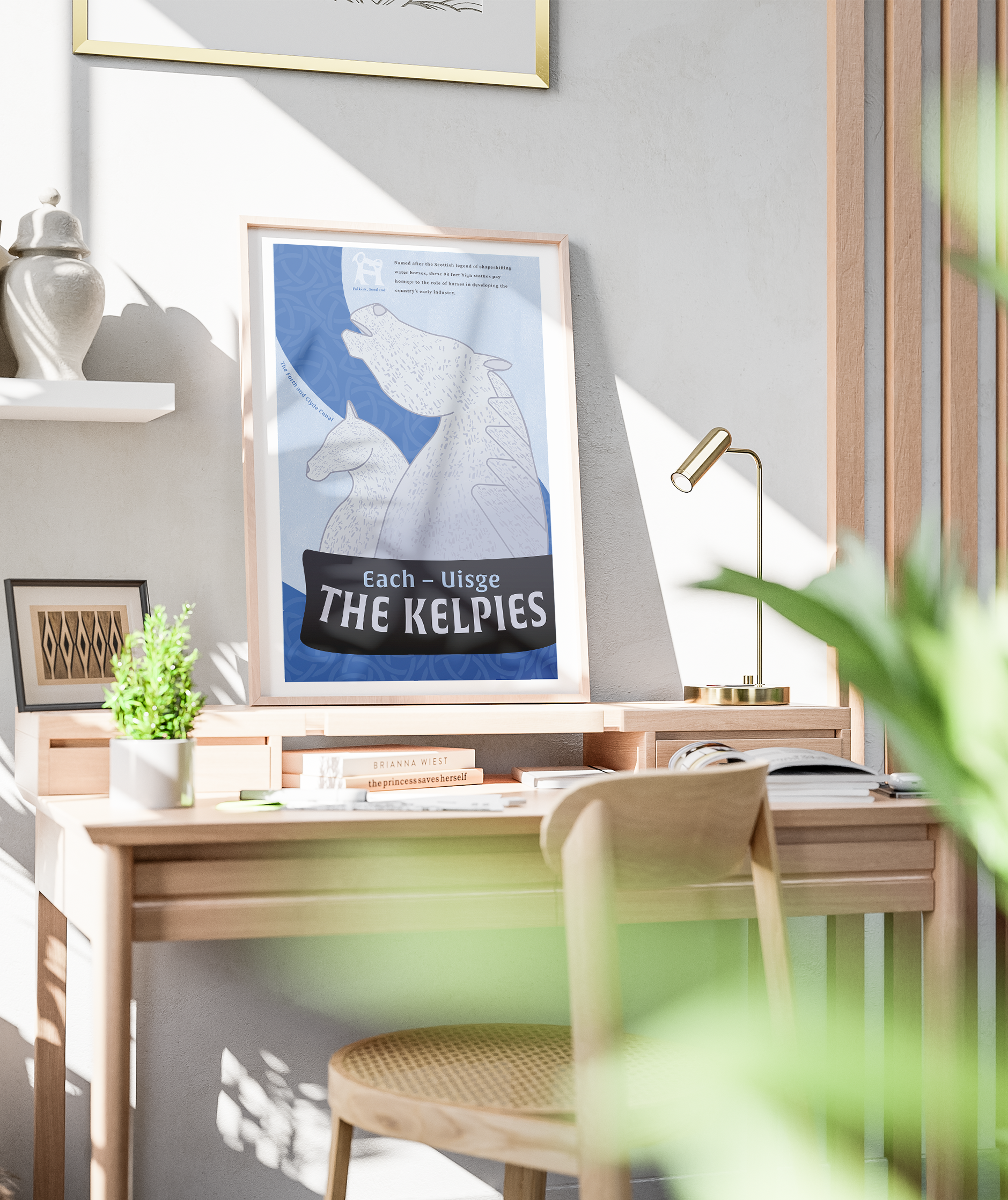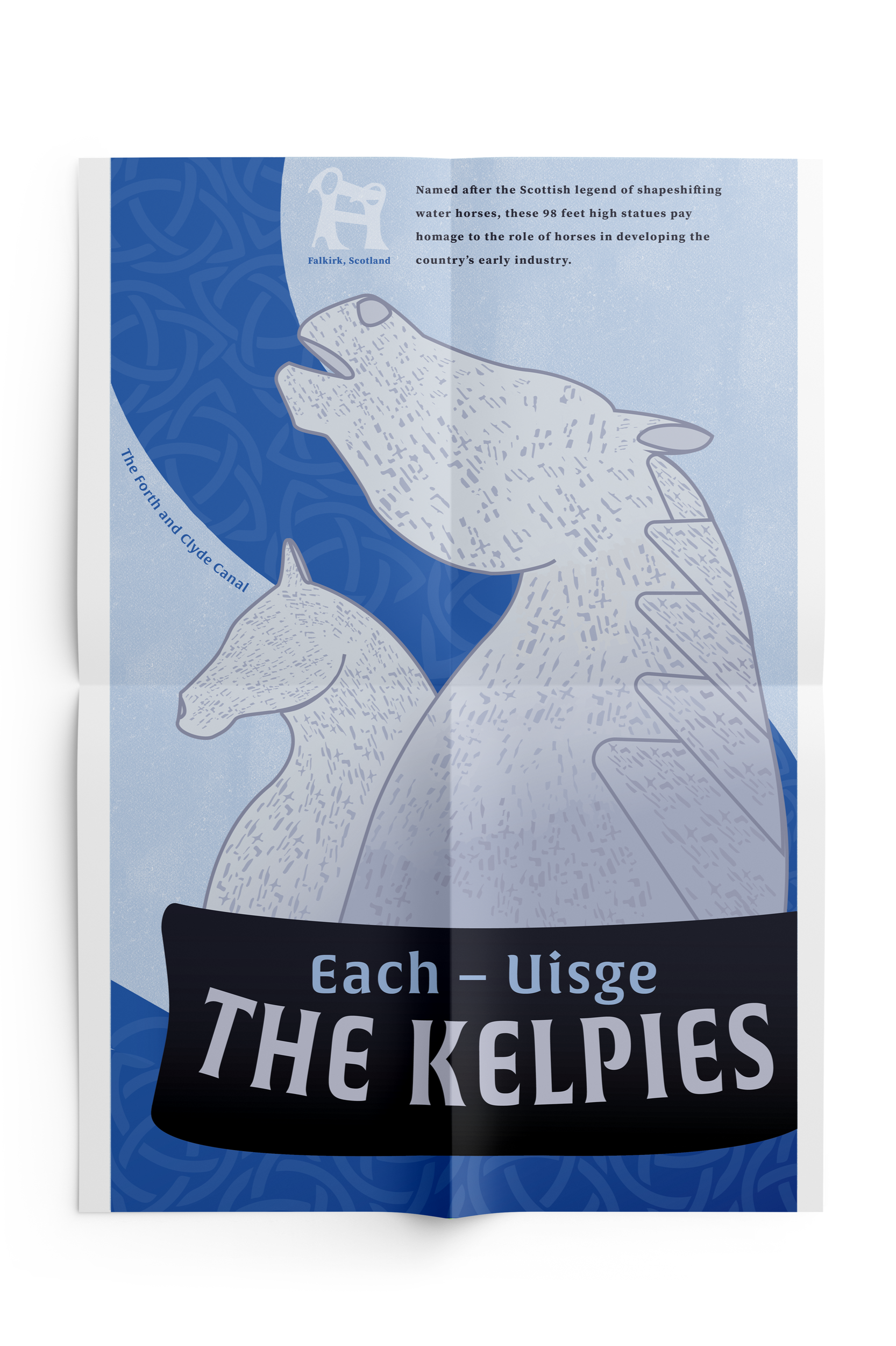 Incorporating colors of Scotland’s flag, as well as various cultural elements such as Celtic patterns, I was able to produce an eye-catching, elegant design paying tribute not only to The Kelpies monument, but the country as a whole.