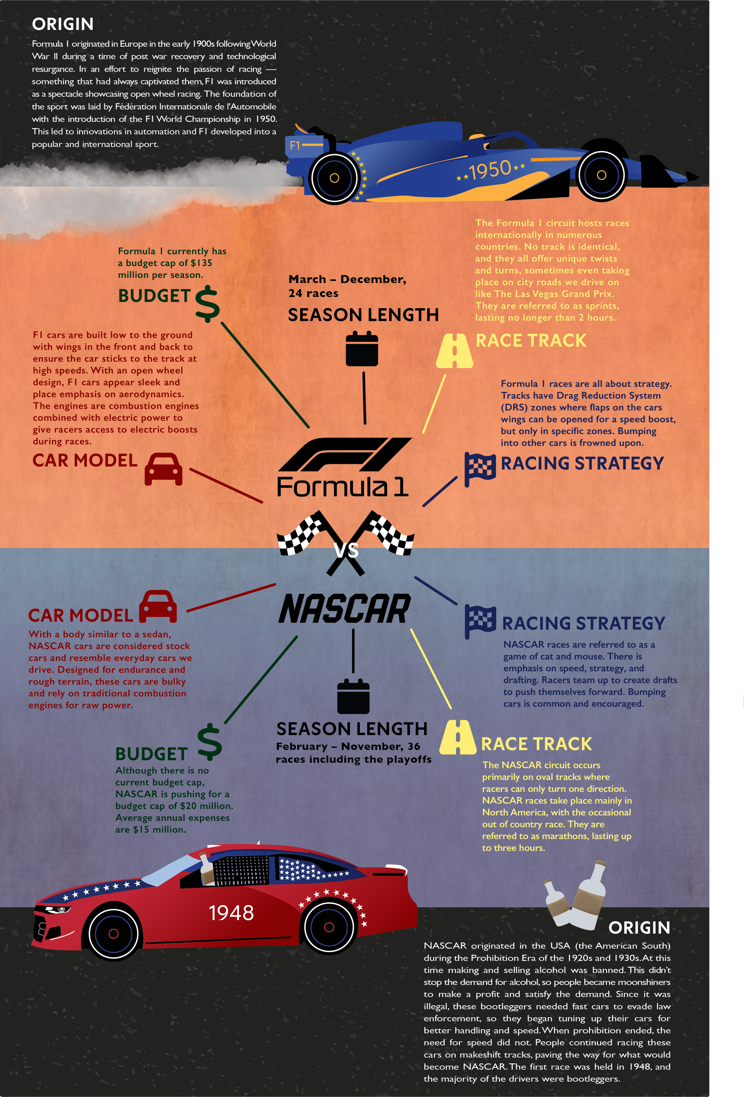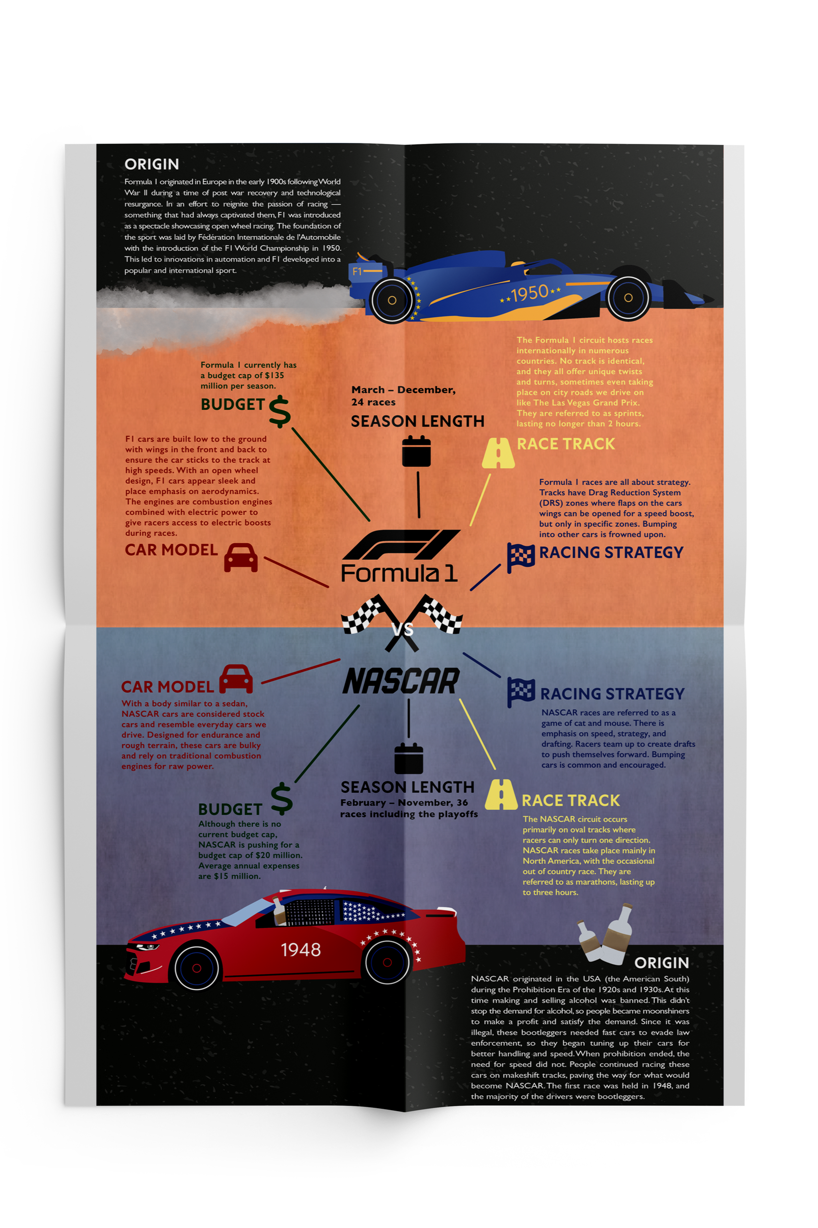 A poster designed to represent the similarities and differences between Formula 1 (F1) and NASCAR racing. I researched both styles of racing and compared statistics such as car model, season length, and budget. This poster was created on Adobe Illustrator with textures added through Adobe Photoshop.