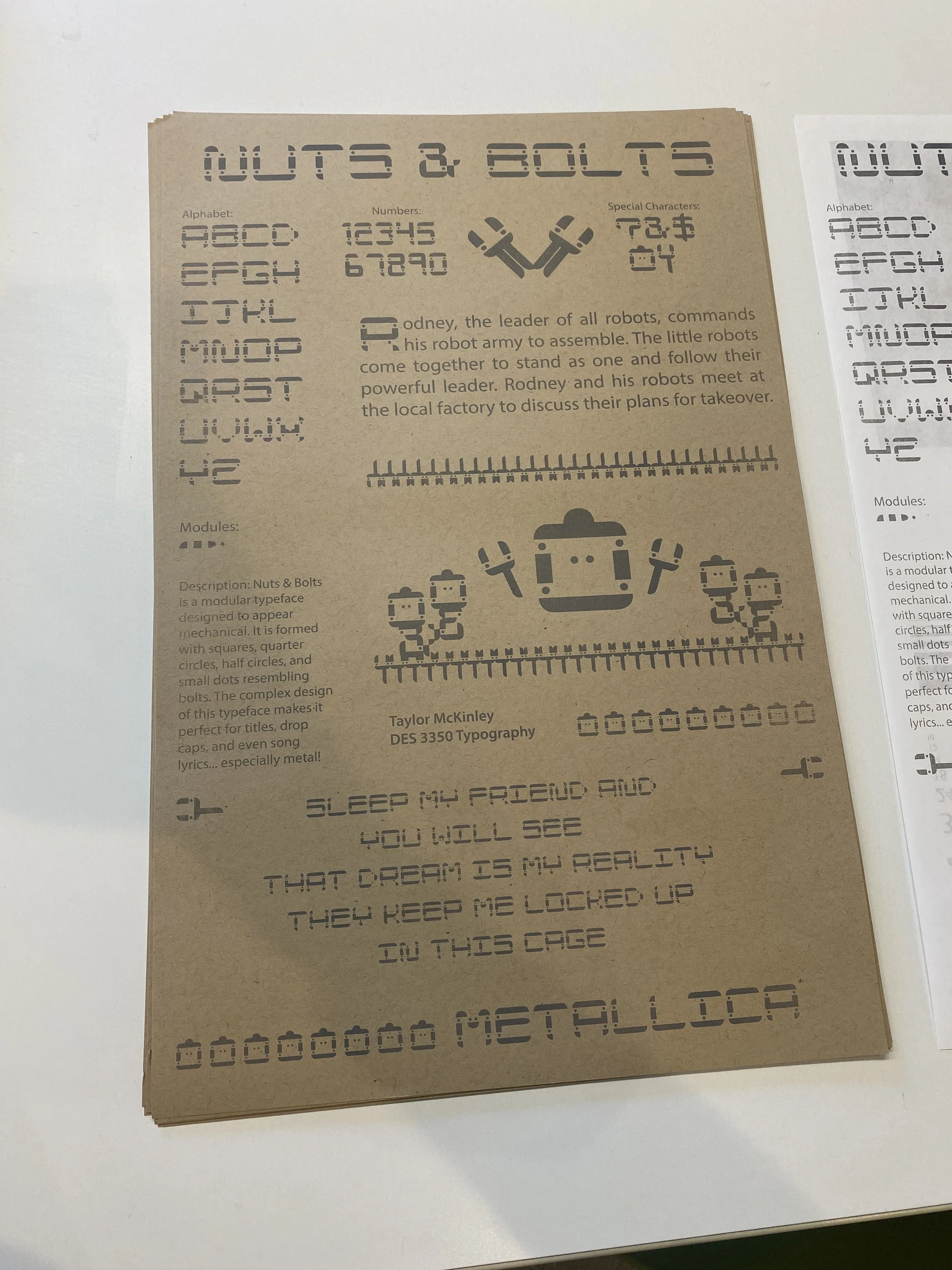 This modular typeface was designed to evoke a metallic, robotic aesthetic, which inspired its name. The typeface includes a full set of capital letters, numbers, and special characters, as well as a custom robot glyph. After completing the character set, I assembled a broadside using Adobe InDesign, which was later printed using a Risograph printer. Below are several images documenting the development process behind this typeface.