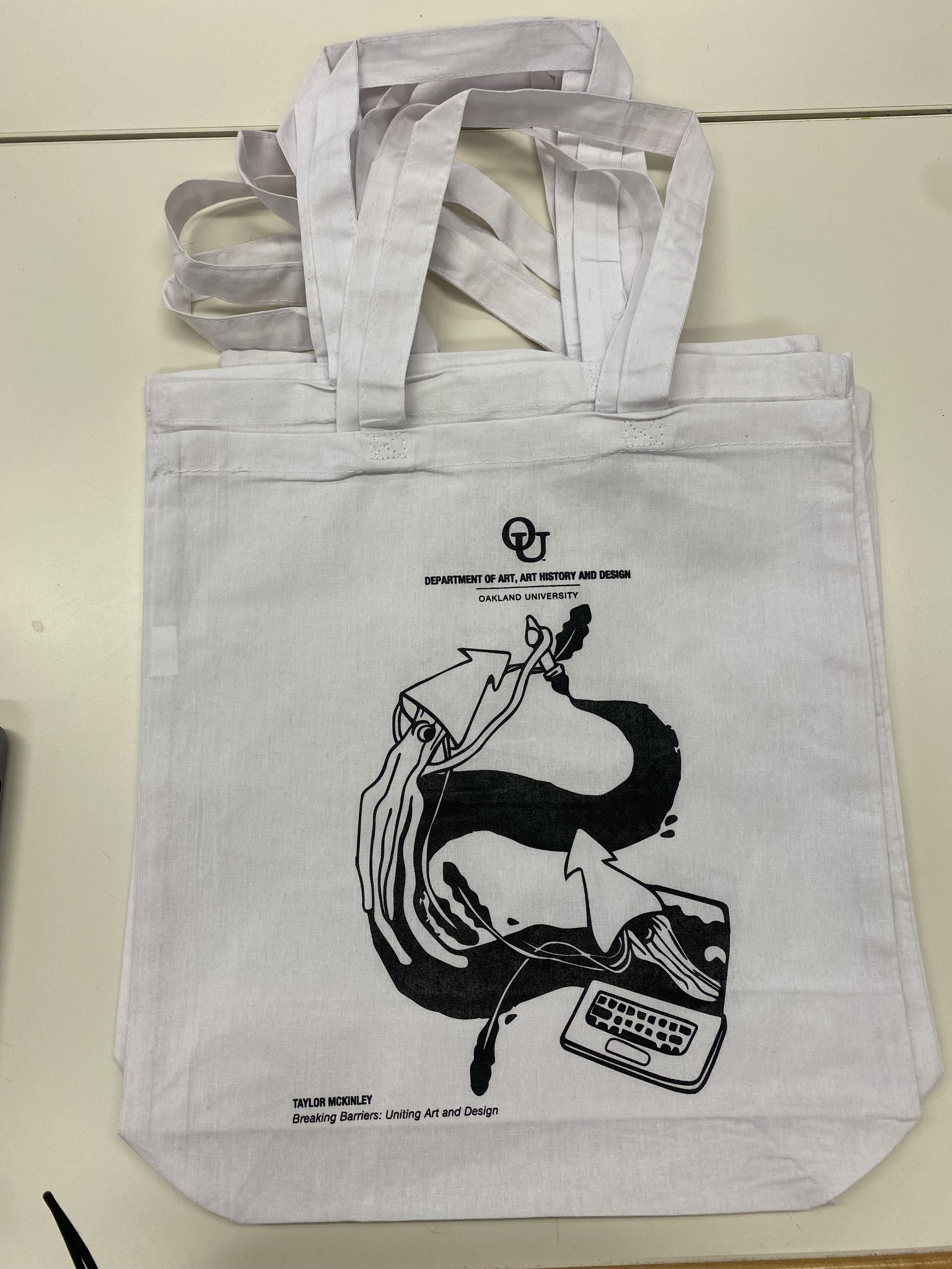 This tote bag design was created for a competition hosted by Oakland University’s Department of Art, Art History, and Design. The concept highlights the connection between graphic design and traditional studio art, such as painting. My design was selected as one of the three winning entries and was produced for distribution at various university events.