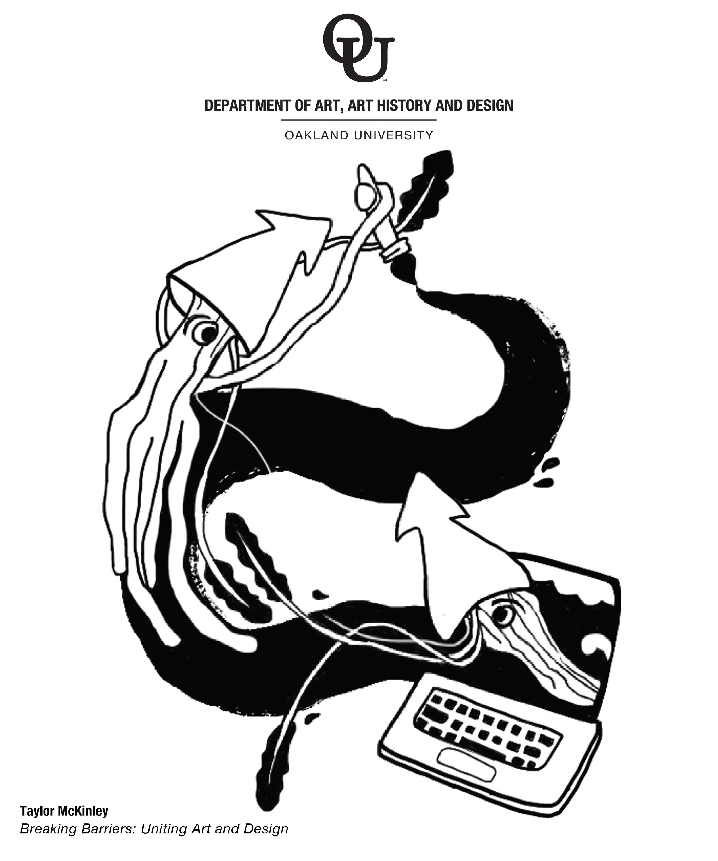 The process for creating this design involved hand drawn sketches of multiple ideas and iterations, eventually landing on the idea of squids. The design features squids as they tie to art through ink. Additionally, their figure allows for a dynamic design and the incorporation of motion. The laptop and paint brush are connected to illustrate the connection between art and design and how they can work together.