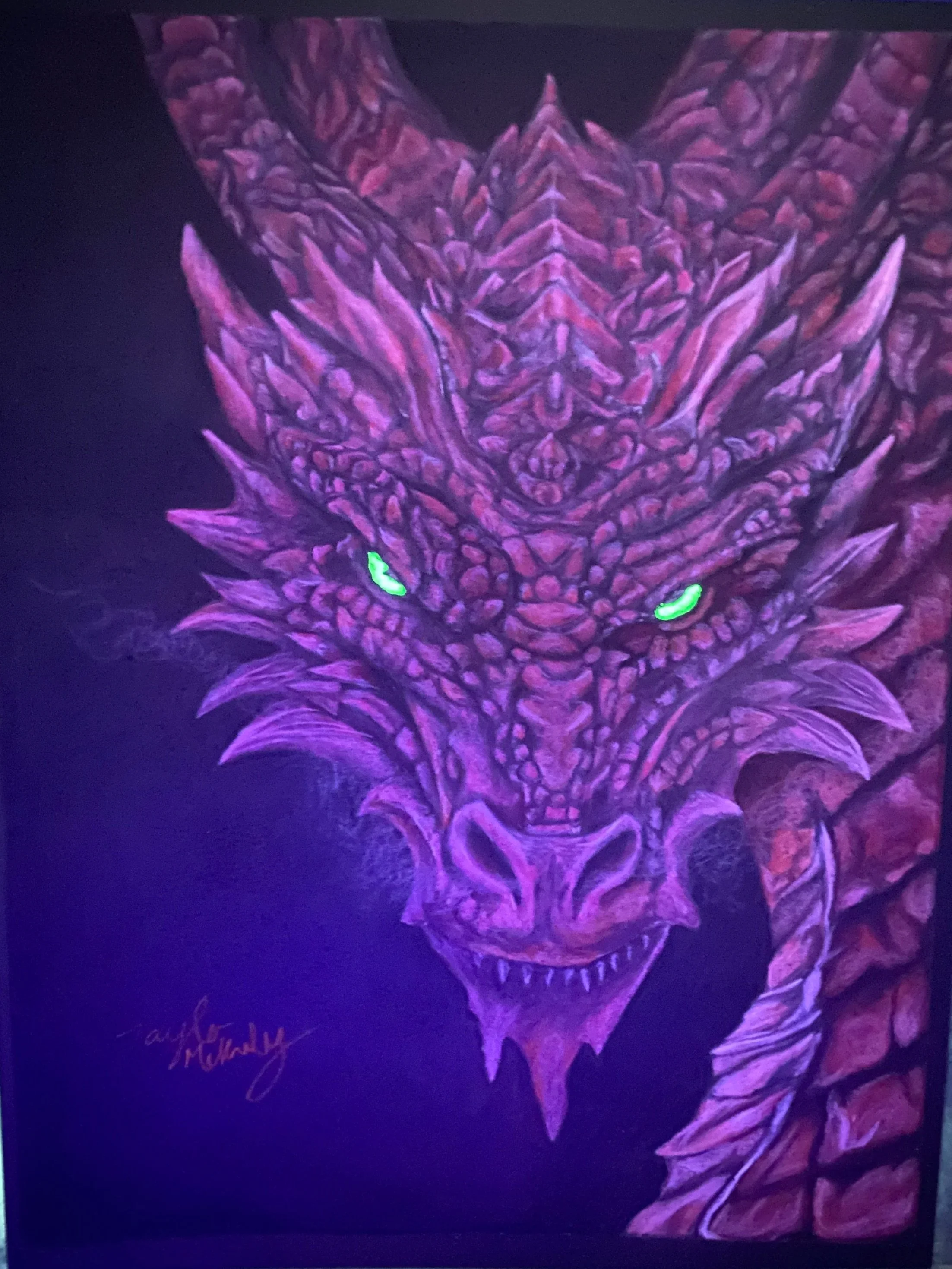 Eyes of a Hunter, 18 inch by 24 inch, charcoal, conte, and glow in the dark oil paint on paper